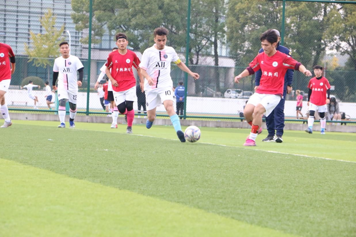 新闻网讯(学生记者 程佳曦 摄影 郜恰)2021年11月11日下午,公共管理队对阵中韩新闻联队(以下简称联队)的男子甲级决赛在南湖校区环湖足球场如期开赛。