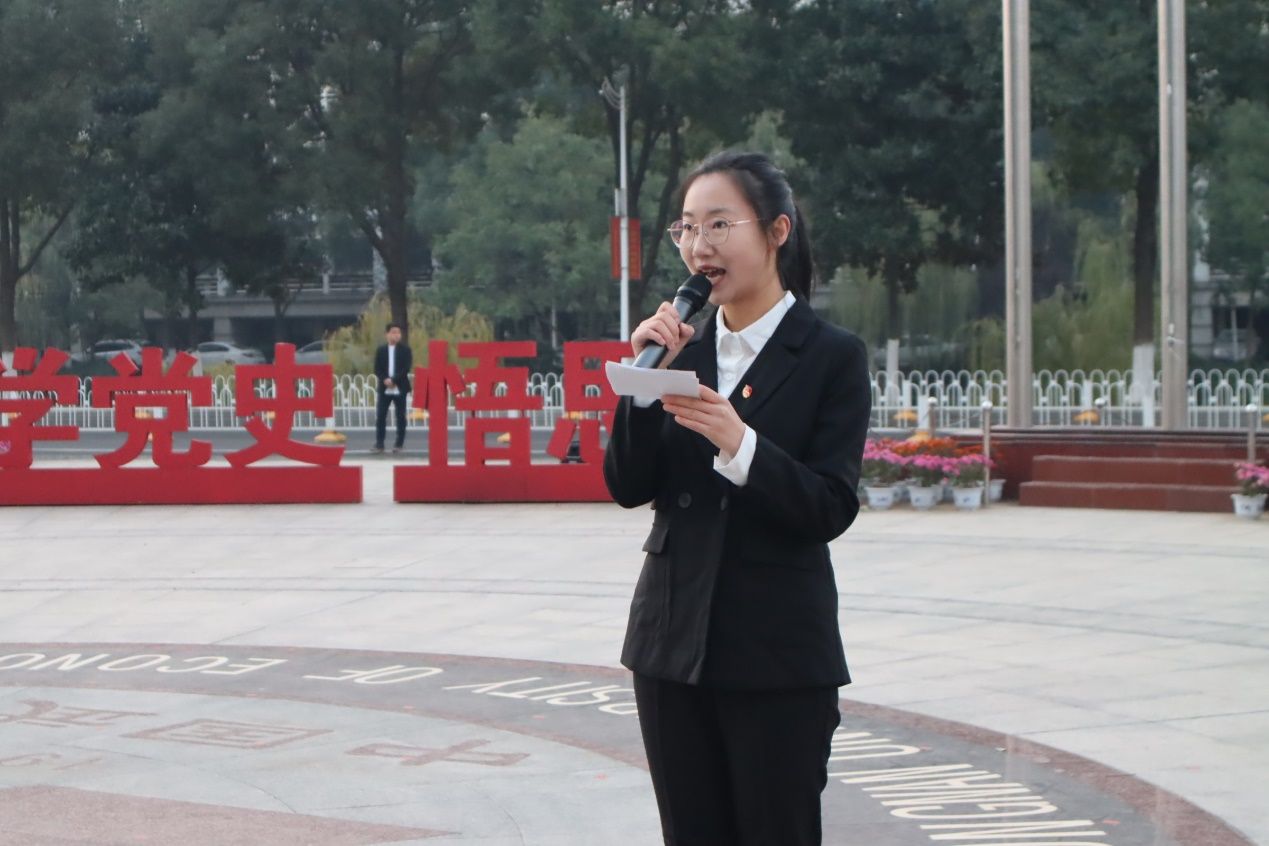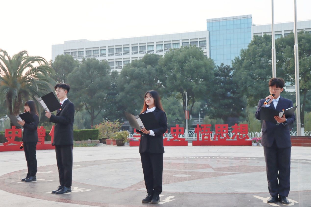 升旗仪式渐近尾声,接下来由我院四位学生代表共同朗诵现代诗《红船,从南湖启航》。“一轮鲜红的太阳,从未有过今天的辉煌。一代一代的掌舵人,开辟的一条中国特色的航线。把我们的航程,永远指向太阳的方向!”朗诵诗篇的末尾,全体师生齐声诵读,满含深情的朗诵声将现场气氛推向高潮,对我们党带领全国各族人民实现中华民族伟大复兴的中国梦充满信心。