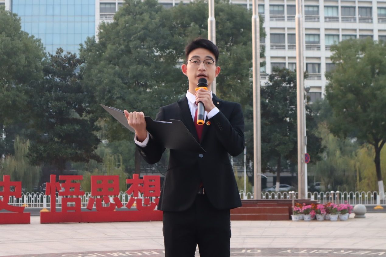 随后,校团委青年骨干党史宣讲团成员、本科生2019党支部党员黄童同学发表国旗下演讲。黄童同学结合党的十九届六中全会精神,指明中国共产党百年奋斗的重大历史意义。同时他总结党过去百年来的奋斗历程,展望未来发展过程中党的领导的重要作用,并对当下的中国青年提出具体要求:要成长为担当民族复兴重任的时代新人。他引用辛弃疾名句“乘风好去,长空万里,直下看山河”,鼓励今日青年积极承担时代赋予的历史责任,去开启祖国盛世新篇章。