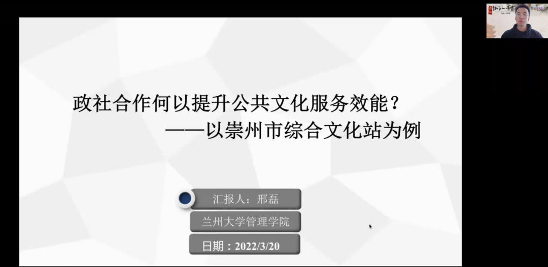 第二小时。兰州大学邢磊介绍了论文《政社合作何以提升公共文化服务效能?——以崇州市公共文化服务购买为例》。文章以崇州市文化服务站为案例,对政社合作提升公共文化服务效能的可能路径进行探究。特邀点评人上海交通大学韩志明老师和武汉大学容志老师肯定了文章的田野基础,同时指出文章需要进一步梳理已有文献、精炼研究问题、理顺文章核心叙事逻辑,明确文章的核心因果机制,并锤炼文章语言表达。