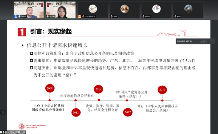 第五小时。上海交通大学杨文婷首先介绍了与上海交通大学樊博合作的论文《制度压力如何影响政府回应型透明?来自全国实地实验的证据》。文章使用实验研究方法对949个政府网回复信息公开申请的情况进行分析,探究不同类型制度压力对政府回应行为的影响。特邀点评人清华大学陈济冬老师和厦门大学于文轩老师充分肯定了文章的研究问题和学术意义,同时指出文章还有必要进一步在和现有文献的对话中明确研究意义,进一步明确英文文献中提出的关键概念的内涵外延,并注意“英文式”中文写作的问题。