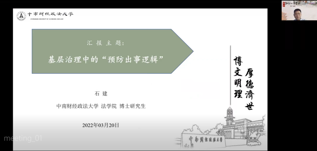 第三小时。中南财经政法大学石建介绍了论文《基层治理中的“预防出事逻辑”》。文章通过对一项安全专项整治行动的分析,探究基层治理中的积极避责行为的内在逻辑和生成机制。特邀点评人东北大学曹海军老师和华中师范大学田先红老师肯定了文章现实意义,同时指出文章需要明确理论视角、明晰新概念提出的价值、聚焦因果机制、优化分析逻辑。