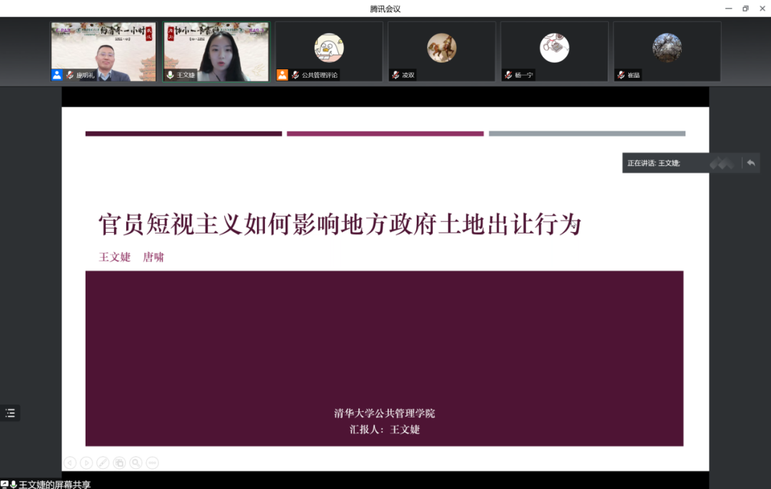 第八小时。清华大学王文婕介绍了与清华大学唐啸合作的论文《官员短视主义如何影响地方政府土地出让行为》。文章使用机器学习方法对2009—2018年281个地级市的《政府工作报告》进行了处理,研究官员短视主义对地方政府土地出让的影响。特邀点评人中山大学梁平汉老师和中南财经政法大学曾婧婧老师肯定了文章规范的研究选题和数据基础,同时指出文章需要进一步提升所选变量的自洽程度,理顺理论主张和指标之间的关系,明确文章的边际贡献。