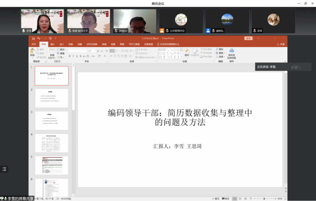 第七小时。西南交通大学李雪介绍了与西南交通大学王思琦合作的论文《编码领导干部:简历数据整理与分析中的问题及方法》。文章对领导干部的简历编码方法中容易出现的问题进行了讨论并提出了解决建议。特邀点评人复旦大学陈硕老师和清华大学杨竺松老师肯定了文章的研究问题和学术意义,并分享了各自在该领域的一手研究经验,同时指出文章需要重视内在框架建构,加强与已有公开数据库和已有研究的对话,进一步挖掘文章涉及的问题,拓展方法的适用主题。