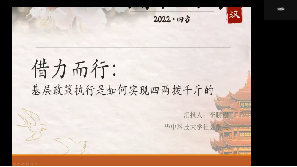 第四小时。华中科技大学李鹏程介绍了论文《“借力”而行:基层政策执行是如何实现四两拨千斤的》。文章基于X市Y区H城管中队的执法案例,探究基层如何纵向借力推动政策目标的实现。特邀点评人南京大学陈家建和复旦大学徐建牛老师肯定了文章田野基础,同时指出文章需要提升写作水平,进一步梳理现有文献,厘清文章的解释机制,正视因果解释中可能存在的循环论证问题。庞明礼老师也现场受邀给文章提出了建议。
