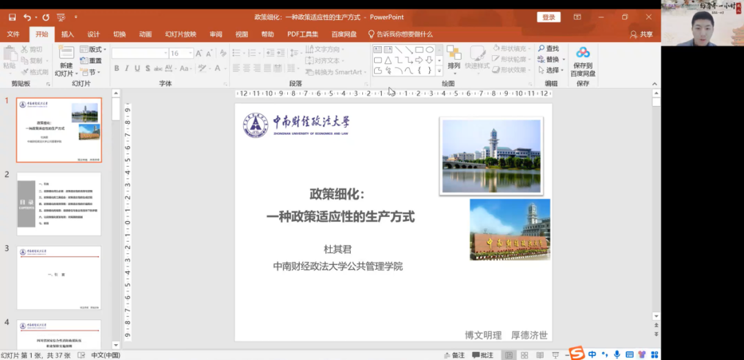 第一小时。中南财经政法大学杜其君介绍了论文《政策细化:一种政策适应性的生产方式》。文章基于对政策细化的必要性、生成过程、结果等的分析,全面讨论了政策细化的概念。特邀点评人中央财经大学崔晶老师和清华大学赵静老师肯定了文章体现出的写作能力,同时建议文章结合田野实证厘清核心研究问题,明确“政策细化”“政策适应性”等关键概念。