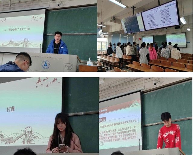 活动第一项,开展党的二十大精神的学习,3月30日下午,城管2101班全体同学在文澜楼210教室,在班级团支书全正尧带领下,开展理论学习。会议伊始,全体同学起立齐唱团歌。“我们是五月的花海,用青春拥抱时代......”同学们声音洪亮、气宇轩昂,展示了良好的精神状态。随后,全体同学开展党的二十大精神的学习。同学们都深刻认识到身为高校学子的我们应当高举社会主义伟大旗帜,弘扬伟大建党精神,牢记“三个务必”,自信自强、守正创新、锐意进取、顽强拼搏,扎实推进中国式现代化建设,为实现党的二十大确定的目标任务而共同奋斗,我们每一位团员青年都应该成为习近平新时代中国特色社会主义思想的坚定信仰者和忠实实践者。同学们主动上台分享自己心中的二十大。付鑫、周语童、岩公叫、陈曜宇、杨含涵、孙璐六位同学分别向大家分享了自己心中的二十大和共青团。通过他们的分享,同学们学习共青团的历史,了解了李大钊、刘伯承、柯晓宾等名人事迹,对二十大精神有了更加深刻具体的理解与体会。最后,全体同学一起交流感想与展望未来。同学们积极踊跃举手,慷慨激昂,畅谈过去取得的成绩,回顾过往的不足,同学们相互鼓舞,相互学习借鉴。