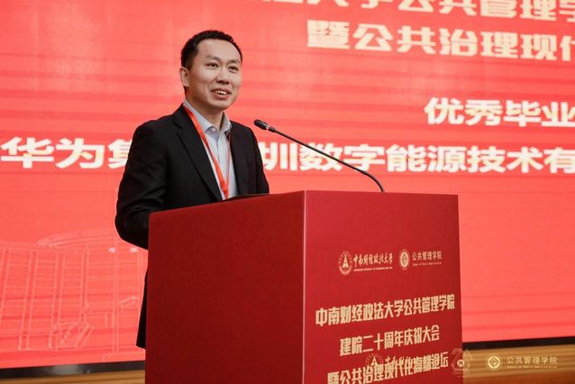 优秀校友代表、华为集团深圳数字能源技术有限公司人力资源总监谭华在发言中表达了对母校、对恩师的思念和感激之情,他表示,学校从社会实践、价值理念和专业学习三方面影响了他的职业生涯,并寄语师弟师妹们要能不畏艰难险阻,勇担时代使命,做有责任担当的公管人,在砥砺前行中为学院建设、为中华民族伟大复兴贡献力量!