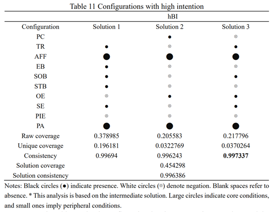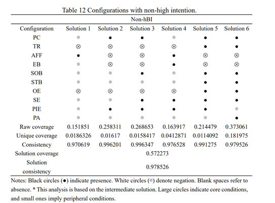 (2)我们进一步使用fsQCA来探索不同自变量之间的组合如何导致特定结果的发生。在产生高行为意愿(hBI)的三条路径中,核心条件包括情感(AFF)和隐私意识(PA),表明这两个条件是公民使用OGD网站行为意愿的重要预测因子。