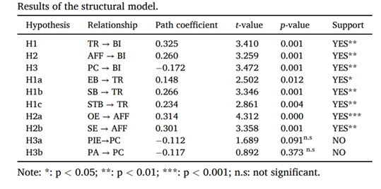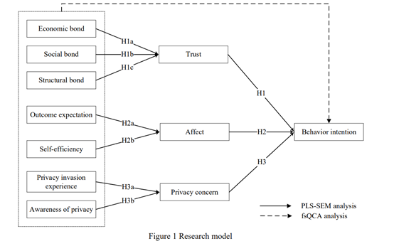针对现有研究存在的可拓展空间,我们建立了一个基于信任理论和SCT的研究模型。随后,我们收集了225名中国公民的数据,并使用偏最小二乘结构方程模型(PLS-SEM)和fsQCA对数据进行分析。