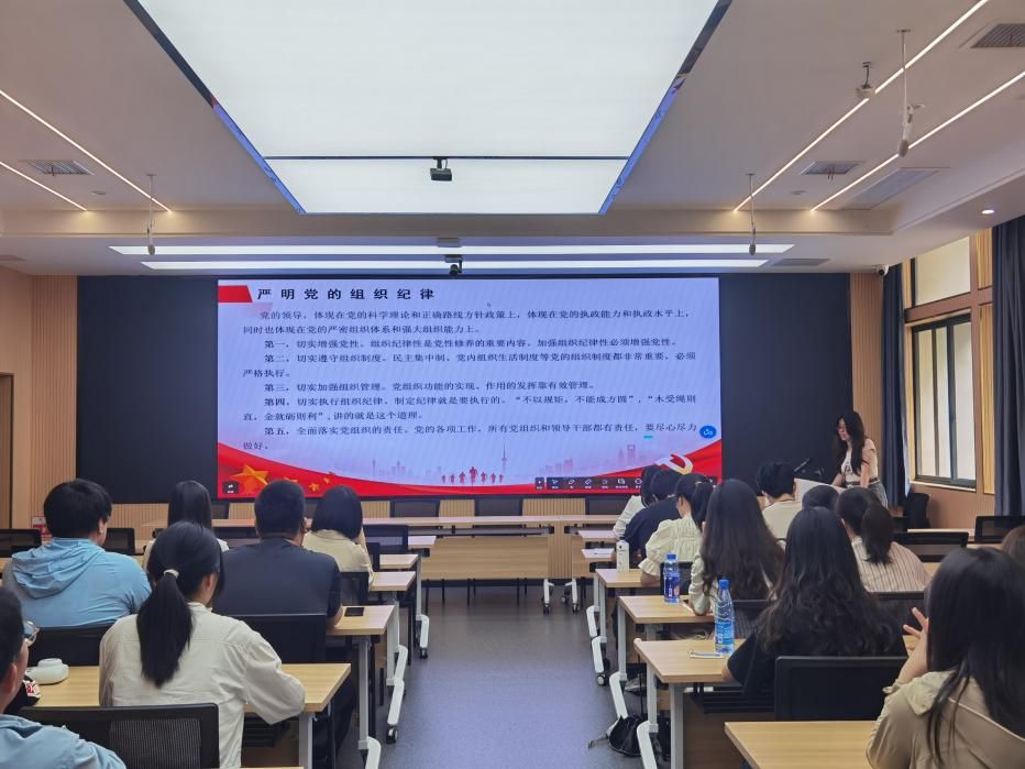 随后,支部书记李荔老师为大家讲授“挺膺担当建新功,奋楫扬帆再启航”主题党课。李老师带领全体党员学习了习近平总书记关于青年工作的重要论述,希望大家贯彻总书记讲话精神,树立、坚定永远跟党走的理想信念,坚持终身学习的理念,勤奋学习、刻苦钻研、加强磨炼、增长本领;正确认识青年的时代责任和历史使命,将远大抱负和脚踏实地有机结合起来,用科学思维认识和改造世界;既要多读有字之书,也要善读无字之书,勇于攻坚克难,到基层、到西部、到祖国最需要的地方去,做成一番事业、做好一番事业。李老师指出,每位党员都应该在离校后继续阅读、学习《中南财经政法大学简明校史》,传承中南大的红色基因,敢于担当,善于作为,走向人民需要的地方,为服务国家富强、民族复兴、人民幸福贡献力量。最后,李老师结合案例,再次强调“严守党纪党规、争做合格党员”的重要性,她对每一位毕业生党员提出了三点要求:第一,守好公私的“分界线”。党员应该在思想上摆正位置,站稳群众立场,克服私心杂念;在行为上,端正作风,牢记公款姓公、公权为民,严格自律、克己奉公。第二,远离法纪的“高压线”。党员应该牢固树立底线思维,自觉遵守国法党纪,常怀敬畏之心,做到思想务实、生活朴实、作风扎实,勤勤恳恳工作,表里如一做人。第三,系好家庭的“情感线”。党员应该把握好感情与原则的关系,加强对亲属的教育监督;时刻提高警惕,不受义气、关系所累,净化本人及家属对外交往,爱惜政治生命。
