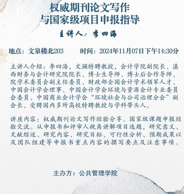 讲座预告——权威期刊论文写作与国家级项目申报指导