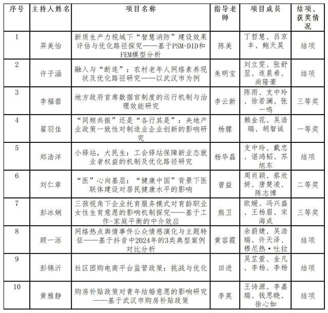 我院2024年度中央高校基本科研业务费项目(C.在校大学生科研创新项目),即第三十八届“博文杯”大学生百项实证创新基金项目(以下简称“博文杯”)成果评审工作已完成,经学院审核共计结项10项。经学校组织专家评审,优秀成果奖共计4项,其中一等奖1项,二等奖1项,三等奖2项。现将名单予以公示(同等级项目排名不分先后)。公示时间:2024年11月05日至11月07日17:00。