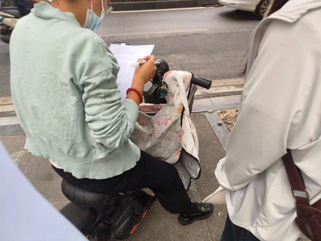 我们沿着街道对非机动车使用者以及行人等分发了问卷,令人欣喜的是,居民对非机动车道的占用问题表现出了极高的关注度,参与度较高。他们的热情参与,为我们深入了解这一问题提供了丰富而宝贵的素材。