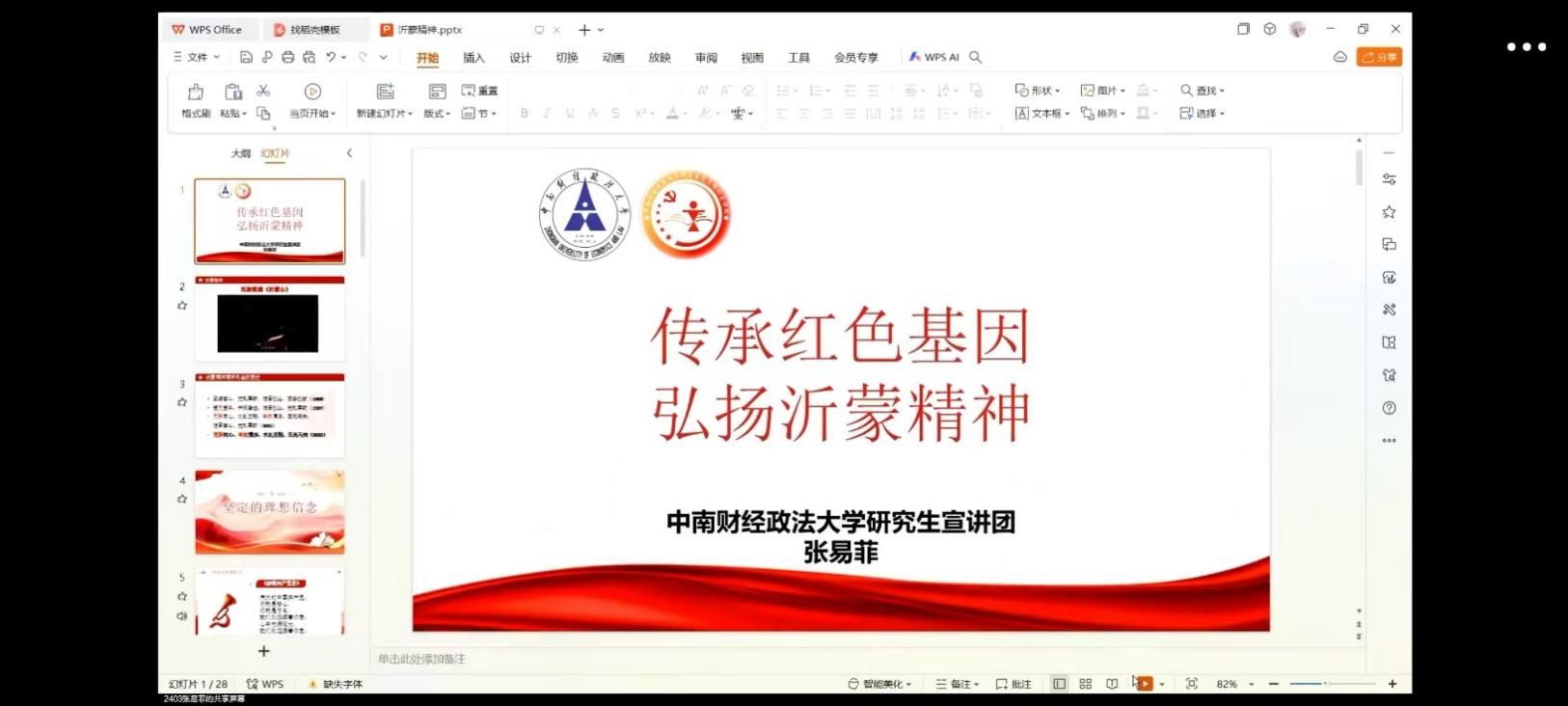 随后,研究生党员理论宣讲团成员张易菲以“传承红色基因,弘扬沂蒙精神”为主题,首先通过视频资料,带领现场观众回顾了沂蒙精神诞生于革命战争年代,发展于社会主义建设时期,改革开放以来得到进一步升华的历史脉络。随后在《跟着共产党走》的歌声中,她动情地讲述了一段段感人至深的故事,让同学们感受到了沂蒙儿女对党的无限忠诚和坚定信仰,展现了共产党人对革命事业的无私奉献。最后,她通过讲述厉家寨村的发展变迁,展现了沂蒙山敢于担当精神在新时代的传承与发扬,并鼓励同学们作为新时代的青年,不断学习、传承、践行沂蒙精神。通过实际行动,将沂蒙精神转化为推动社会发展的强大动力,为实现中华民族伟大复兴的中国梦贡献青春力量。