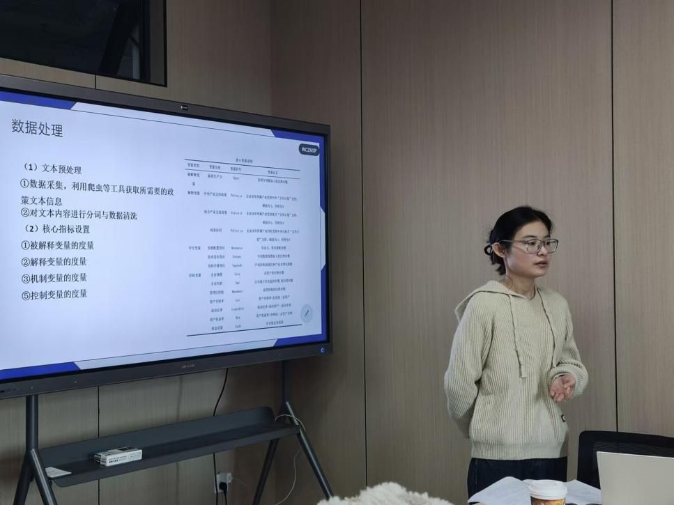 汇报结束后,参会同学围绕研究背景、变量测度与研究意义等方面展开了热烈讨论。凌双老师就新质生产力的测度指标、变量设置,以及创新点等方面提出了建议,并为同学们解释实证模型所涉及的稳健性与内生性检验等问题,现场学术氛围浓厚,与会同学收获颇丰。